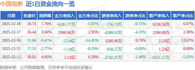 xk星空体育:股票行情快报:中国电影(600977)12月18日主力资金净卖出618177万元