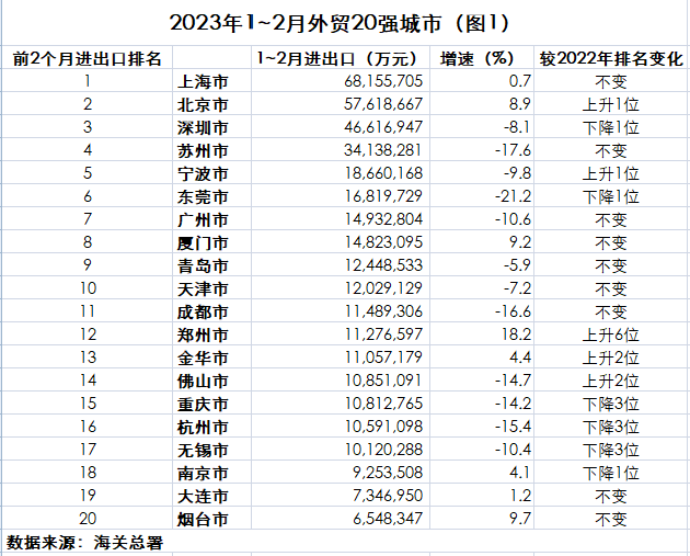 xk星空体育:1-2月外贸20强城市出炉 北京列第二 郑州出口逼近广州